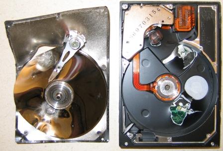 The more impressive shots that I have personally seen involved a .25-06 (high powered hunting rifle) and a 12 Gauge slug and two of my brother-in-laws. With the .25-06, we turned the hard drive sideways and shot into the thin side of the drive and popped the spindle. The result was quite impressive. It just plain exploded. Then my brother-in-law pulled out his 12 Gauge and shot through the platters of another hard drive. The hole through the drive was just massive. You could stick the 12 Gauge shell through the hole. Unfortunately I don’t have pictures of either of these. They were both thrown away by mistake before I could get a picture. The picture is one that my friend Philip took of a HD that he shot with the .45. On the right half just below the serial number, you can see the .45 slug that was inside the case when he picked it up after shooting it.