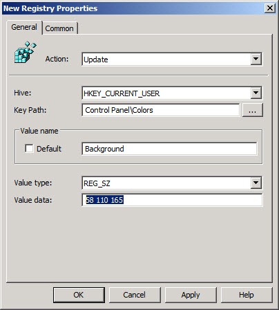 8. Set a particular color as the Background Color on the desktop. Normally this is desired as an initial preference with users allowed to change it afterwards. Do this via Group Policy Preferences. The following screenshots will show you how to do this…