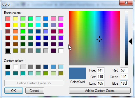 Third, set the numbers in the “Value data” field to the RGB numbers of the color you wish. To obtain the RGB numbers, open up any color dialog (font color for example), then choose custom which should open up something that looks like the screenshot below. Choose the Red/Green/Blue numbers from the bottom right corner.