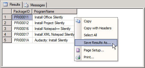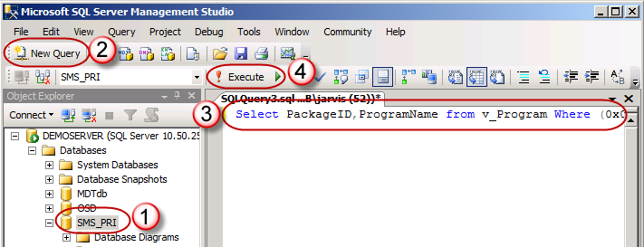 Another simple query can be used to obtain the Package:Program info. This time however we are going to run the query in SQL Management Studio. I know there must be a way to write this query to work as a query in the Configuration Manager console, but I still get confused converting SQL to WQL…so you get the SQL. Thanks to John Nelson for posting a similar query on his blog that pointed me in the right direction! The query to use is: