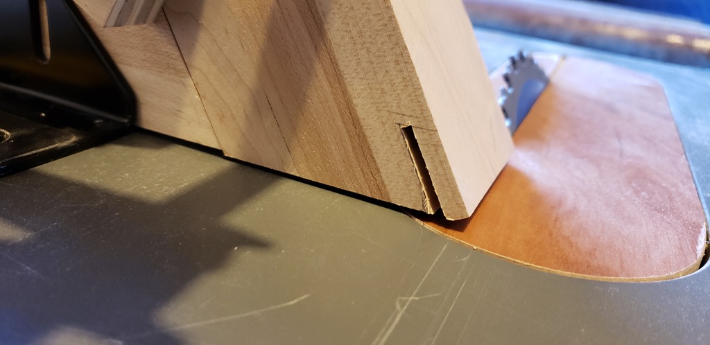 That process helped me learn two things. First…I needed to cut both pin blocks at the same time in order for the angles to line up perfectly. Second…the miter gauge that came with my saw was simply not going to work for this…it kept slipping a little bit on the angle. So I quickly built a better 90 degree mini-sled to use for my crosscuts. I couldn’t use my regular cross cut sled because the blade on the saw was going to be angled at 30/60. This sled was made out of a block of hard maple on top and a piece of scrap bamboo flooring for the runner.