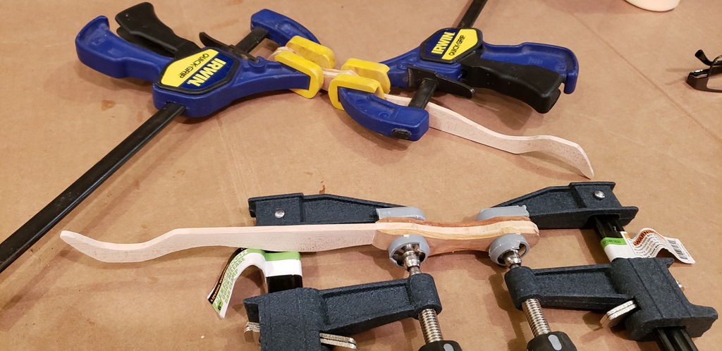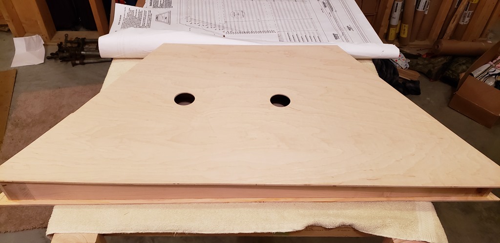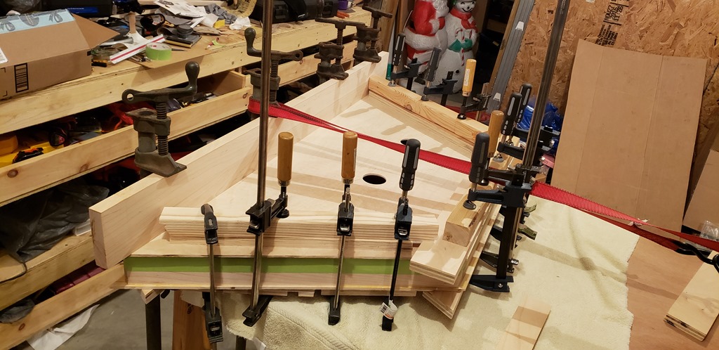 Then it was time to rough cut the soundboard out of 1/4 inch maple plywood. I also had to measure out and carefully cut the sound holes in the top before gluing it down…again with a lot of clamps.