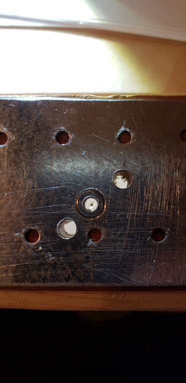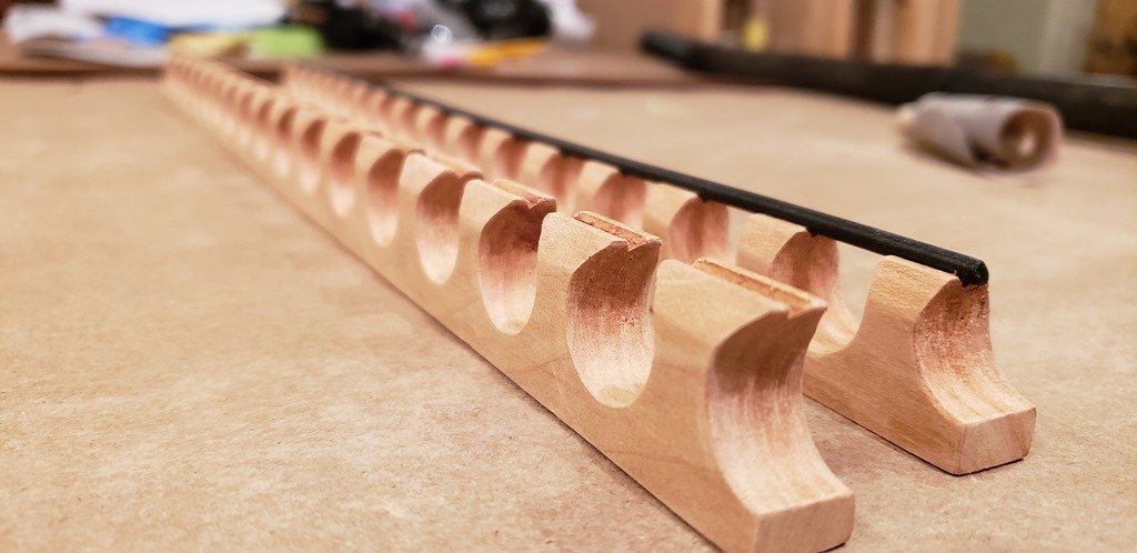 The plans called for having a long piece of delrin run the length of each bridge. I didn’t like the way that looked, and I also knew that I needed a way to mark every fourth set of strings, so I bought a piece of white delrin to use for marking those. I cut them to size and glued each one in place with a drop of super glue.