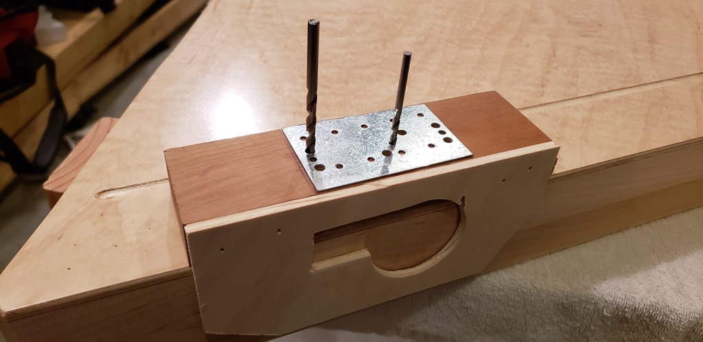 However…before I could drill any of those lovely holes that I marked, I had to figure out how to drill them perfectly straight. This thing is simply too large and bulky for the drill press. This led me to build this little jig which worked fantastically. This is a piece of scrap cherry that has a notch cut out of the bottom side. On the top and bottom, I glued two pieces of steel that I had on hand (steel used for joining framing). I then took that to the drill press and very carefully measured holes to be exactly the right depth from the edge to line up perfectly with the three lines of holes I needed to drill. Then I nailed a piece of scrap plywood to the side to help it line up on the edge of the frame. The two pieces of steel keep the drill bit aligned perfectly perpendicular, so I was able to use my hand drill for drill all of the holes…but I still got the accuracy of a drill press. A light shining in the hole underneath let me clearly see the marks I made above.