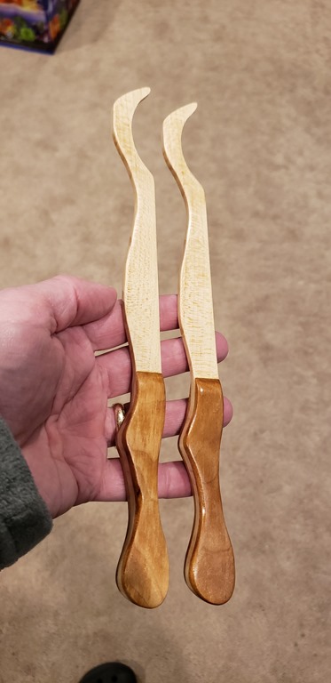 While the poly was drying on the bridges, I took time to make the hammers. I modeled them as closely as I could on the shape of the hammers I saw Rich Mullins playing in one of the YouTube videos above. The hammer itself is made out of an approximately 1/8 inch thick piece of hard maple. The handle scabs are 3/16 inch cherry. These were made predominantly with a band saw and belt sander.