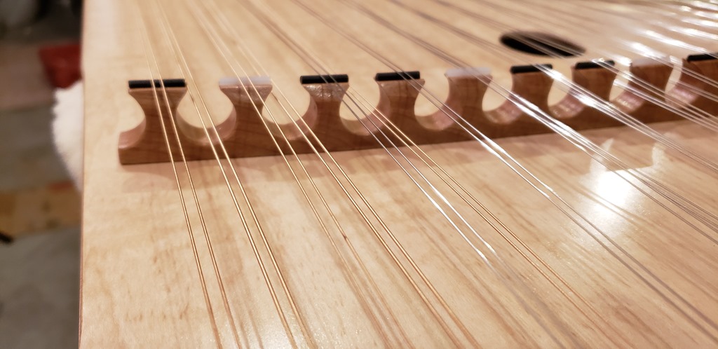 After getting the bass bridge strung, here is the final result! Also note, that the cherry of the bridges has already started to darken up nicely just in a few days.