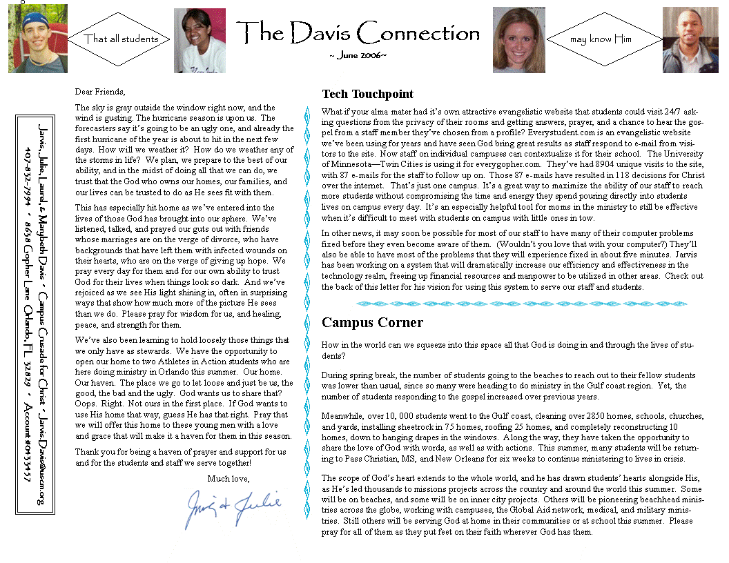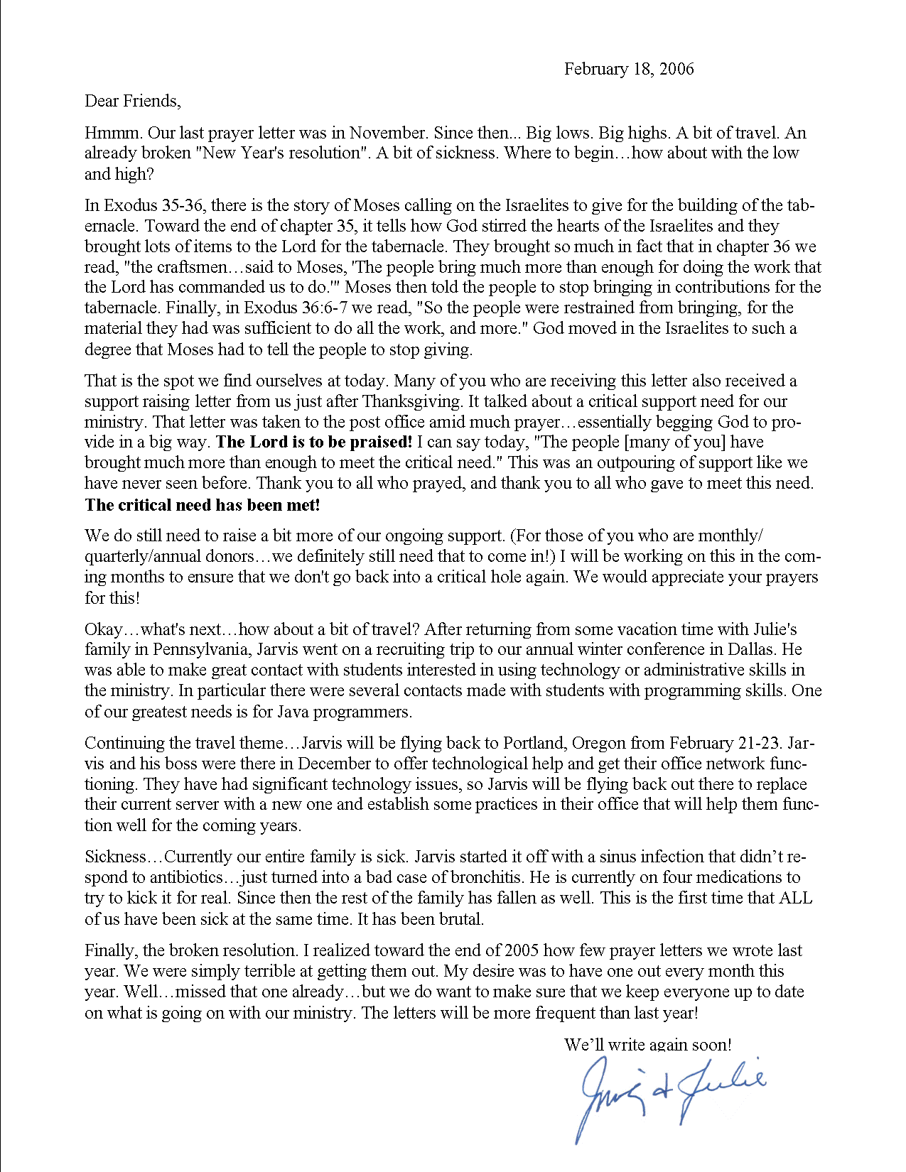 This is a long overdue page that has links to many of our past prayer letters that we have sent out through our ministry. It was really discouraging as I was building this page to see how few letters we have actually sent out over the last three years…and especially 2007. We are taking steps this year to be more consistent with getting letters out. Hopefully the rest of 2007 and next year will be better than our past record. Click on a link to go to a letter. These links open in a new window, so you might need to fiddle with your pop-up blocker if it doesn’t open. Some of these letter are in Acrobat format. You can download a free reader for Acrobat files from either Adobe or Foxit. Personally I prefer Foxit…it’s much smaller and faster.