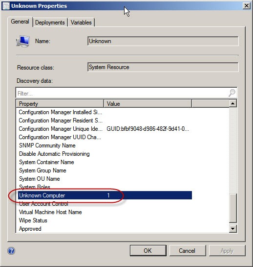 This computer object has the MAC address and BIOS ID of the previously unknown computer…except that it is now a Known computer…not an Unknown computer…although the System Resource “Unknown Computer” property is set to “1”.